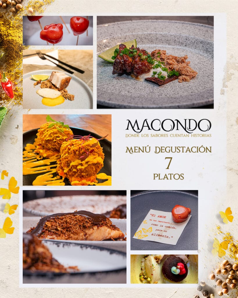 Cada plato, inspirado en las páginas de Gabriel García Márquez, lleva los aromas, texturas de la Colombia caribeña: carnes que humean, tubérculos que saben a raíces, dulces que guardan memorias y frutas que ya no existen.
